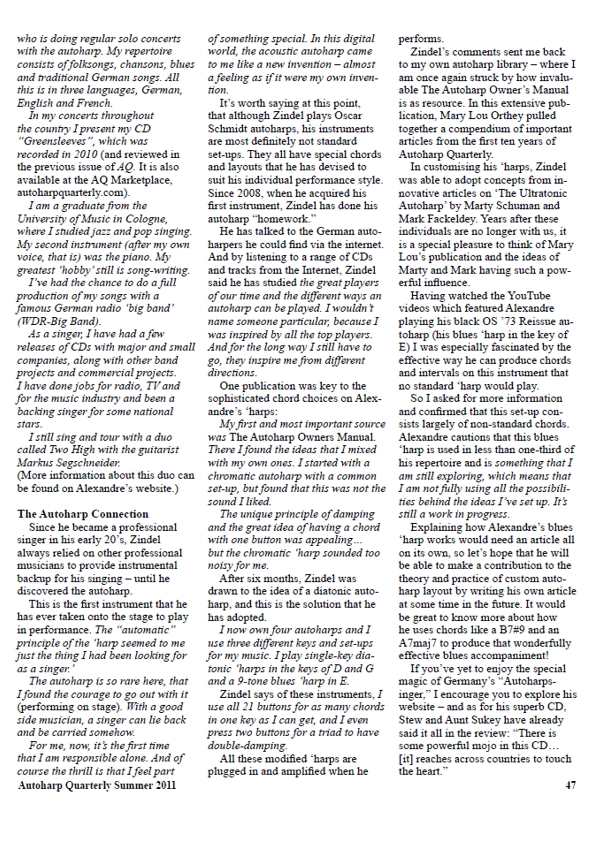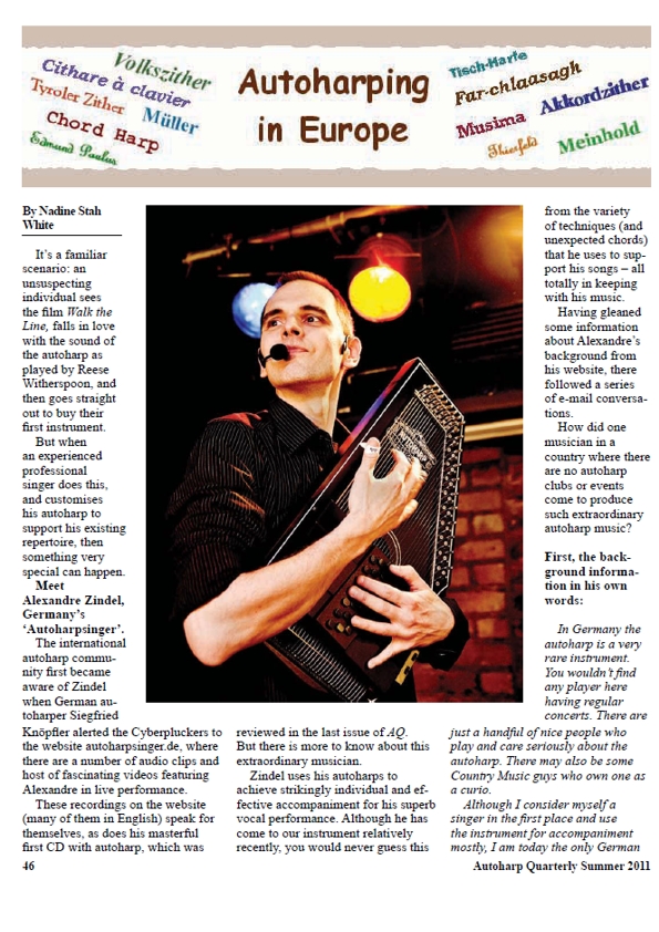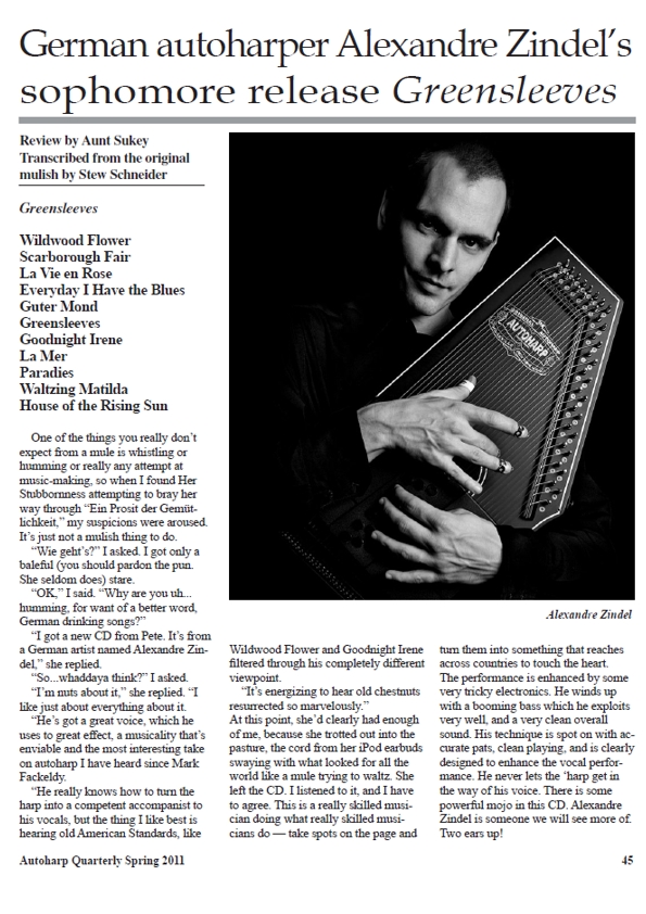 Ich mag so ziemlich alles daran. Er hat eine großartige Stimme, die er mit großer Wirkung einsetzt, eine Musikalität, die beneidenswert ist und den interessantesten Zugang zur Autoharp, den ich seit Mark Fackeldy gehört habe. Er weiß wirklich wie man eine ‘Harp in einen kompetenten Begleiter für seine Stimme verwandelt, aber was ich am meisten mag, ist, wie er alte amerikanische Standards wie “Wildwood Flower” und “Goodnight Irene” durch seine komplett andere Sichtweise filtert. Es ist anregend, alte Kastanien so wunderbar wiederbelebt zu hören. (Anmerkung: Bei uns sind es vielleicht eher die alten Schinken.) ... Das ist ein wirklich erfahrener Musiker, der tut, was wirklich erfahrene Musiker tun - die Punkte auf dem Notenpapier zu nehmen und sie zu etwas zu verwandeln, dass über Länder hinweg das Herz berührt. Die Darbietung ist verbessert durch sehr trickreiche Elektronik. Er kommt heraus mit einem boomenden Bass, den er sehr gut ausnutzt. und einem insgesamt sehr klaren Klang. Seine Technik ist treffend mit akkuraten Schlägen, sauberem Spiel, und ist eindeutig dazu bestimmt, die Gesangsdarbietung zu aufzuwerten. Er lässt die ‘Harp niemals der Stimme in die Quere kommen. Da ist ein kraftvoller Zauber in dieser CD. Alexandre Zindel ist jemand, von dem wir noch mehr sehen werden.